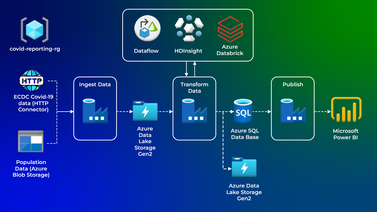 This project analyzes COVID-19 spread and impact across Europe in 2020 using ECDC data. Cloud tools like Azure Data Factory, HDInsight, and Databricks process and transform the data, which is stored in a SQL Data Warehouse. Key metrics include cases, deaths, hospitalizations, ICU admissions, and testing. The analytics team uses this data for insights and predictive modeling to support pandemic management.