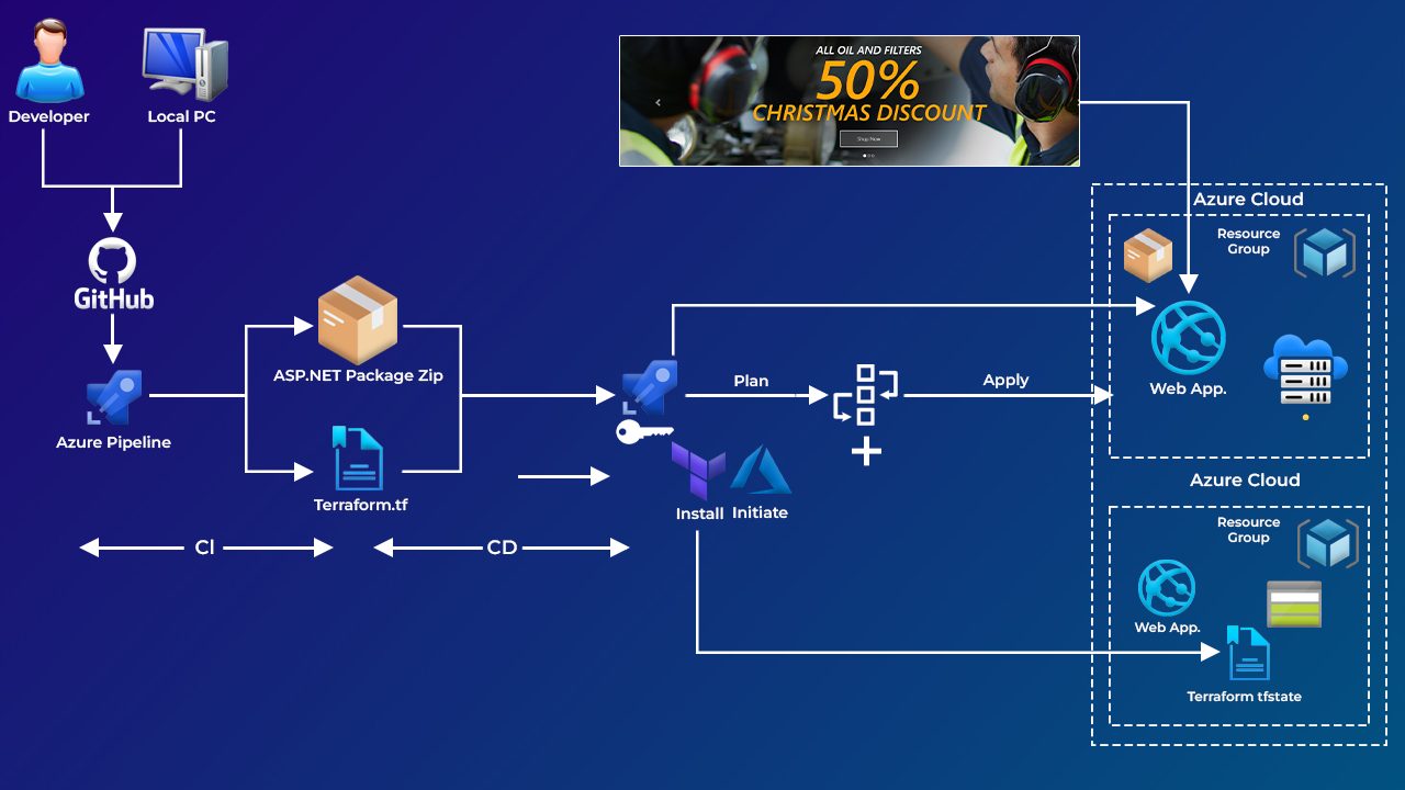 In this project, you will learn how to incorporate Terraform into Azure Pipelines (CI/CD) for implementing Infrastructure as Code (IaC) to create Azure Web App and deployment of .Net Application (same logic can be used to deploy Java or Python or any other application) on Azure Web App.