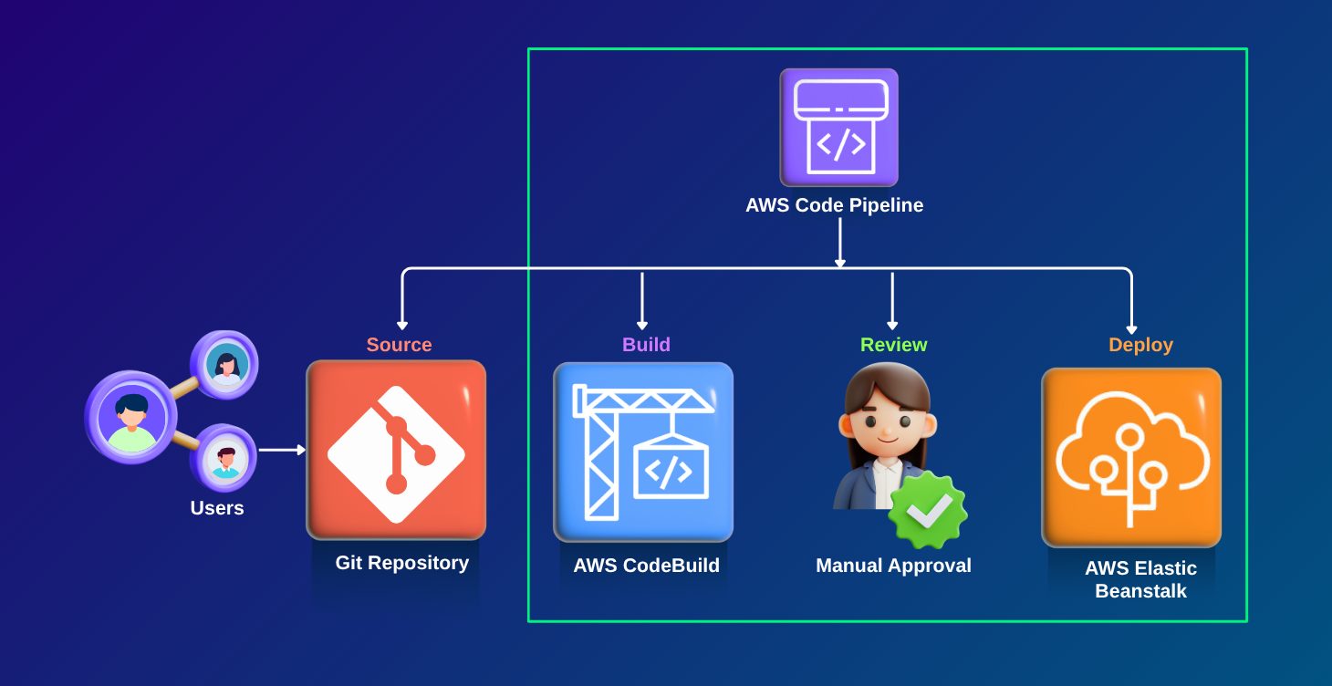 In this project, we’re setting up a continuous delivery pipeline for a web application using AWS services. Starting with forking a starter repository, we push changes to our new repository, test them, and configure an Elastic Beanstalk app for deployment. Next, we create a building project using AWS CodeBuild, configure it with a buildspec file, and test the project. Then, we create a delivery pipeline in AWS CodePipeline, configuring source, build, and deploy stages. We finalize the pipeline with a review stage for manual approval. Finally, we cleaned up resources by deleting Elastic Beanstalk apps, the pipeline, S3 bucket contents, and the CodeBuild project.