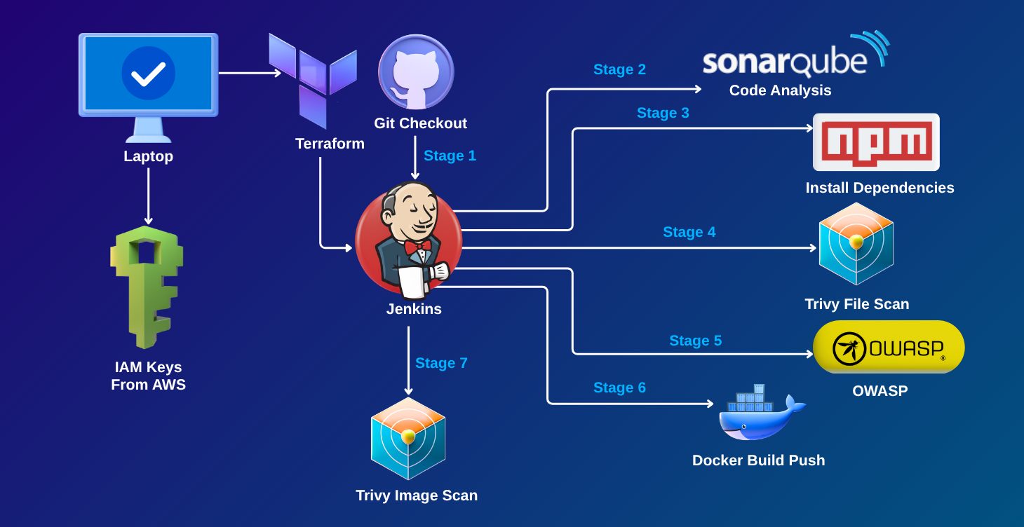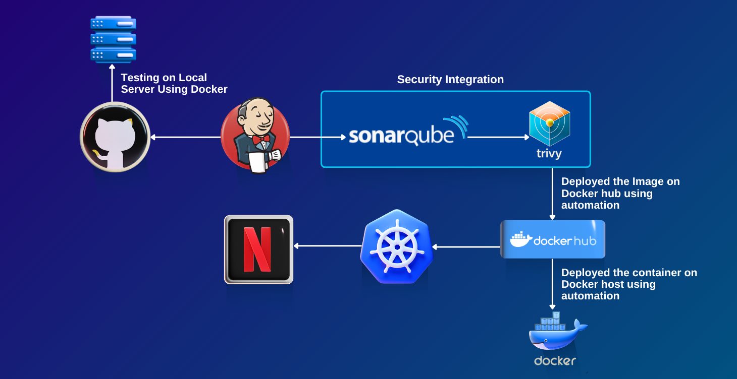 This project integrates Docker, Jenkins, SonarQube, Trivy, and Kubernetes to automate the deployment of a Netflix clone app. It emphasizes security with SonarQube for code analysis and Trivy for vulnerability scanning. By streamlining the process, it ensures reliability, scalability, and security, enhancing the application’s overall robustness and deployment efficiency.