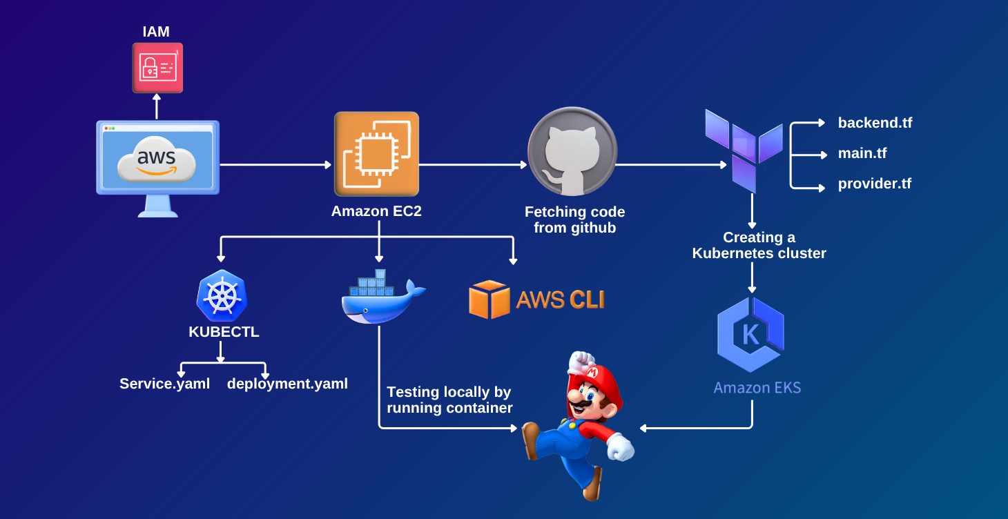 This project involves deploying the Super Mario game onto a Kubernetes cluster using Terraform for infrastructure provisioning. Terraform is used to define and create the necessary infrastructure components, such as Kubernetes clusters, networking resources, and storage. Once the infrastructure is set up, Kubernetes manages the deployment, scaling, and orchestration of the Super Mario game application within the cluster. This deployment approach ensures scalability, reliability, and efficient management of the game application infrastructure.