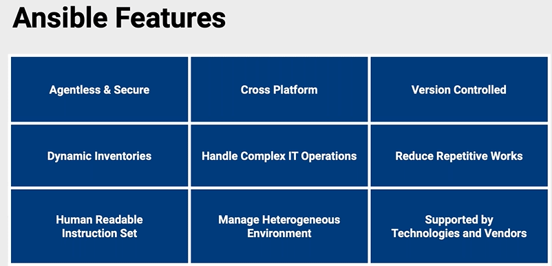 Human Readable: Ansible is using the popular YAML format for playbooks and no scripting knowledge is required.